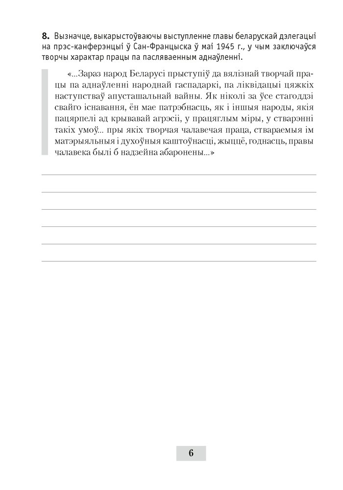 Рабочы сшытак з’яўляецца часткай вучэбна-метадычнага комплексу па гісторыі Беларусі і падрыхтаваны ў адпаведнасці з праграмай і вучэбным дапаможнікам. Выданне змяшчае заданні рознага ўзроўню складанасці, якія накіраваны на засваенне вучнямі тэарэтычных, факталагічных, храналагічных, картаграфічных вучэбных гістарычных ведаў.