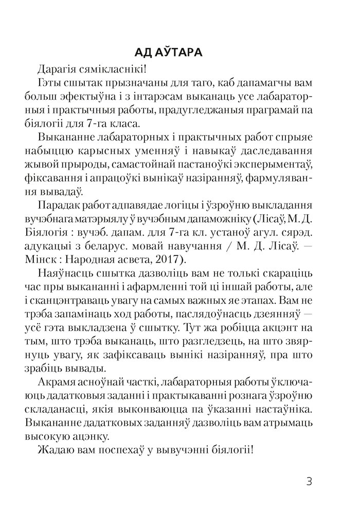 Сшытак падрыхтаваны ў адпаведнасці з праграмай і вучэбным дапаможнікам «Біялогія» для 7 класа (аўтар М. Д. Лісаў). Выданне прызначана для больш эфектыўнага выканання вучнямі лабараторных і практычных работ на ўроках, а таксама падчас экскурсій. Яно дазволіць не толькі сэканоміць час пры выкананні і афармленні той ці іншай работы, але і сканцэнтраваць увагу на самых важных яе этапах. Прыведзеныя заданні рознага ўзроўню складанасці дапамогуць вучням лепш зразумець і замацаваць матэрыял, а настаўніку — арганізаваць дыферэнцыраваны падыход да навучання біялогіі.