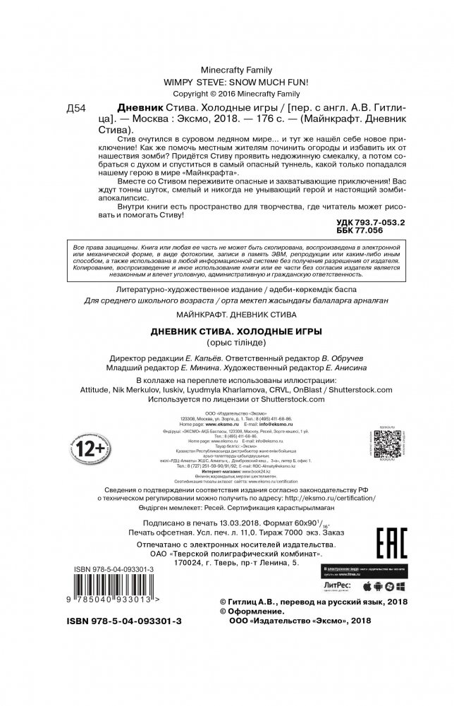 Стив очутился в суровом ледяном мире… и тут же нашёл себе новое приключение! Как же помочь местным жителям починить огороды и избавить их от нашествия зомби? Придётся Стиву проявить недюжинную смекалку, а потом собраться с духом и спуститься в самый опасный туннель, какой только попадался нашему герою в мире "Майнкрафта". Вместе со Стивом переживете опасные и захватывающие приключения! Вас ждут тонны шуток, смелый и никогда не унывающий герой и настоящий зомби-апокалипсис. Внутри книги есть пространство для творчества, где читатель может рисовать и помогать Стиву!