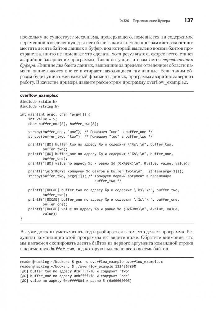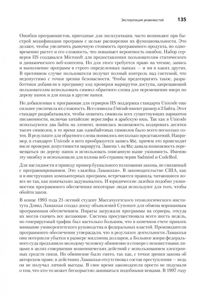 Каждый программист по сути своей — хакер. Ведь первоначально хакингом называли поиск искусного и неочевидного решения. Понимание принципов программирования помогает находить уязвимости, а навыки обнаружения уязвимостей помогают создавать программы, поэтому многие хакеры занимаются тем и другим одновременно. Интересные нестандартные ходы есть как в техниках написания элегантных программ, так и в техниках поиска слабых мест. С чего начать? Чтобы перезаписывать память с помощью переполнения буфера, получать доступ к удаленному серверу и перехватывать соединения вам предстоит программировать на Си и ассемблере, использовать шелл-код и регистры процессора, познакомиться с сетевыми взаимодействиями и шифрованием и многое другое. Как бы мы ни хотели верить в чудо, программное обеспечение и компьютерные сети, от которых зависит наша повседневная жизнь, обладают уязвимостями. Мир без хакеров — это мир без любопытства и новаторских решений.