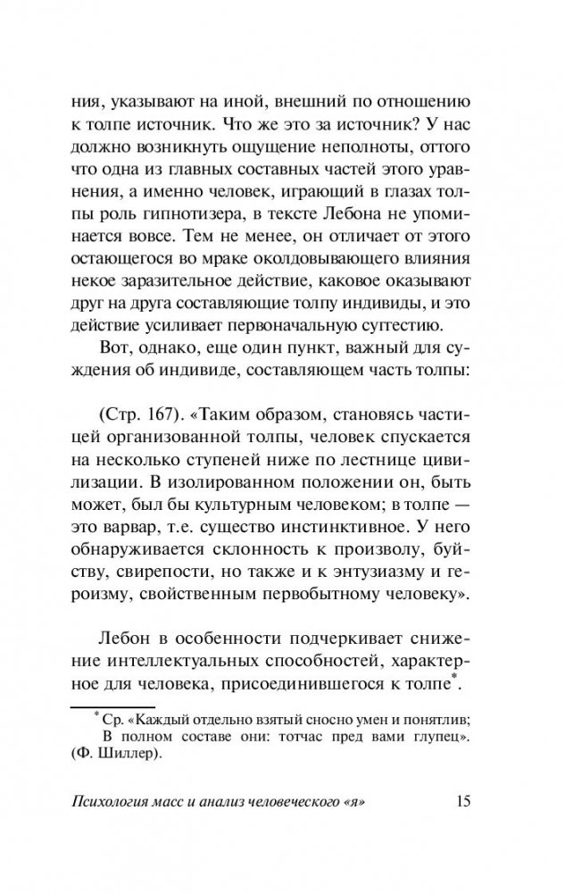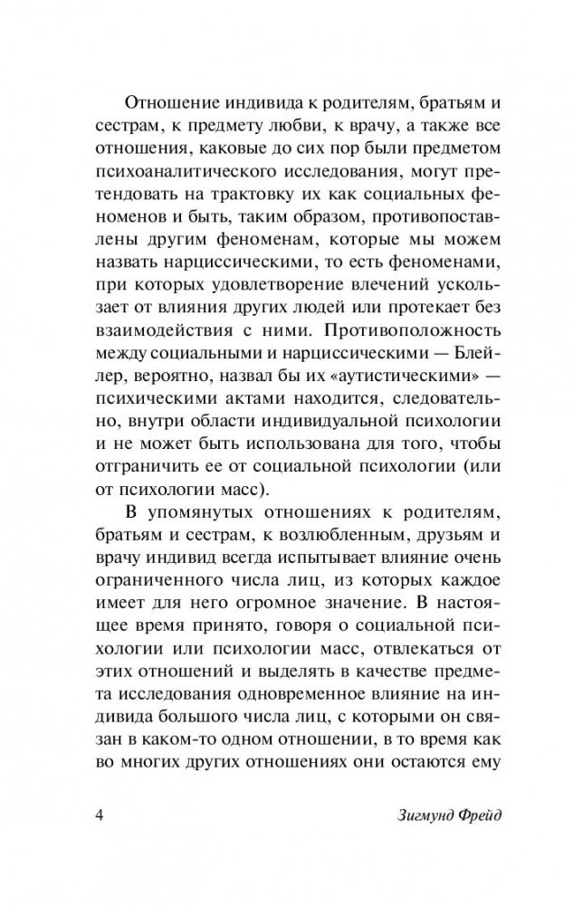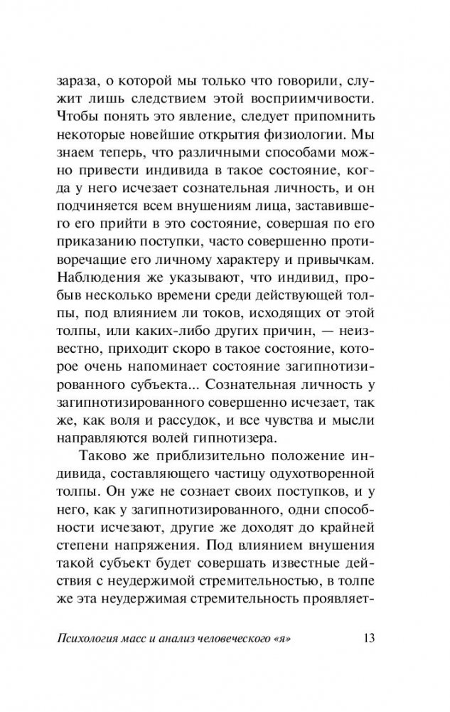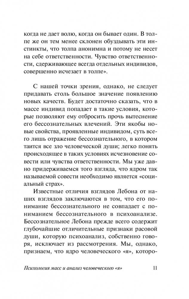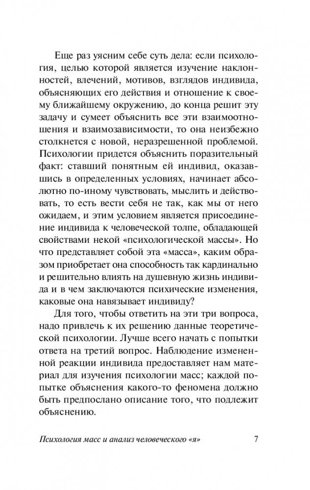 Одна из самых известных работ Зигмунда Фрейда, написанная в развитие идей, высказанных Гюставом Лебоном в книге «Психология народов и масс». Психология толпы. Чем она отличается от психологии одного конкретного индивида? Почему, оказавшись в толпе, люди зачастую отказываются от собственного «я» и отпускают на волю инстинкты, которым никогда не дали бы проявиться в обычных обстоятельствах? Куда исчезают страх, совесть и чувство ответственности? Почему в толпе отключается осознанное восприятие реальности и стираются индивидуальные черты?