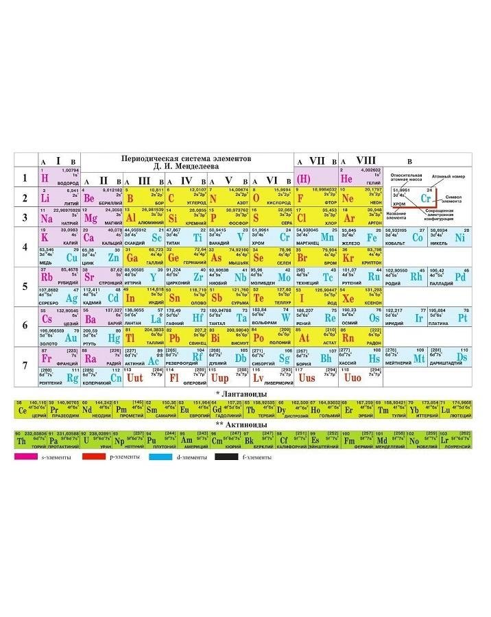 Периодическая система химических элементов Д. И. Менделеева. Таблица растворимости кислот. оснований, солей в воде и цвет вещества. Формат А5.