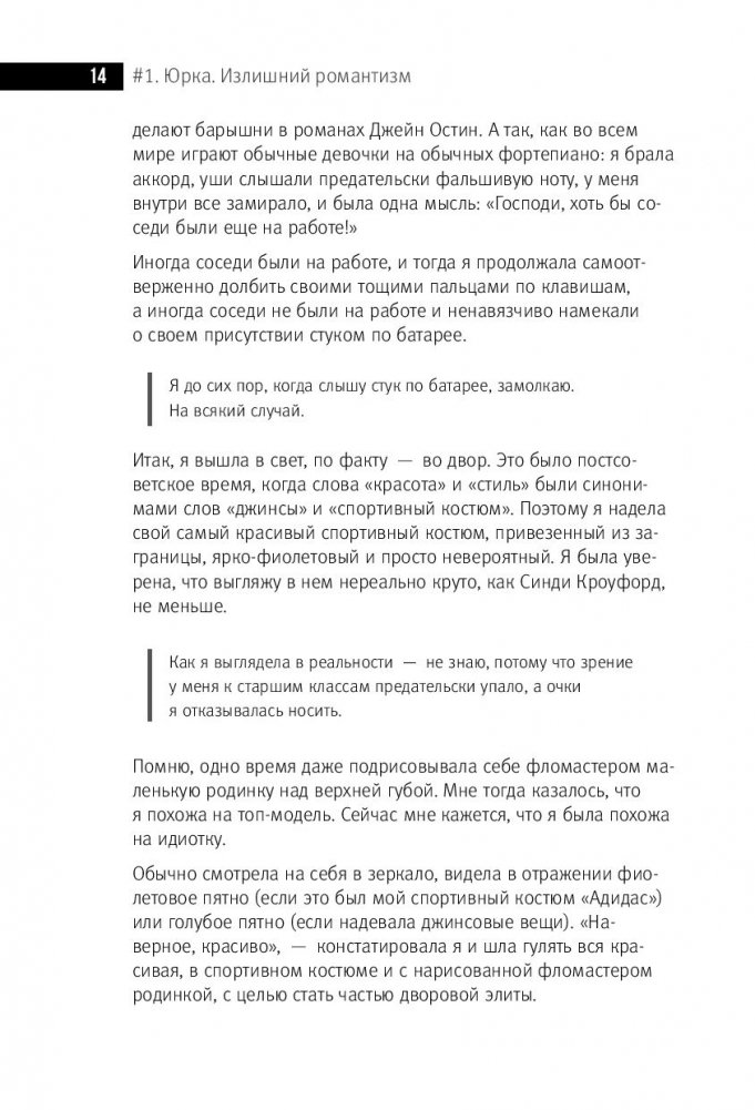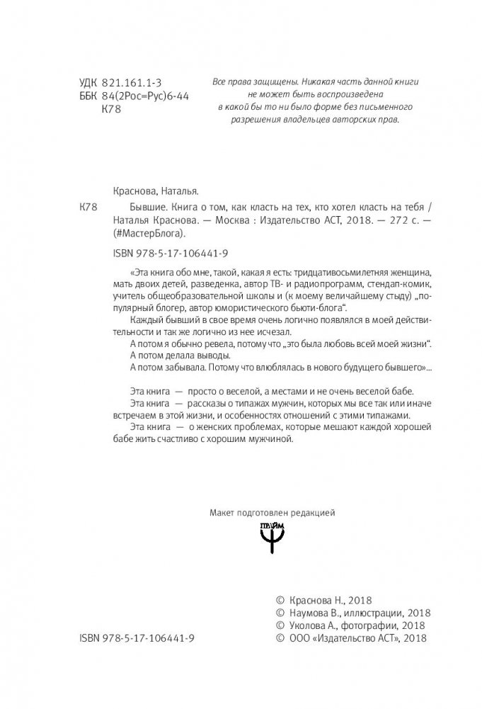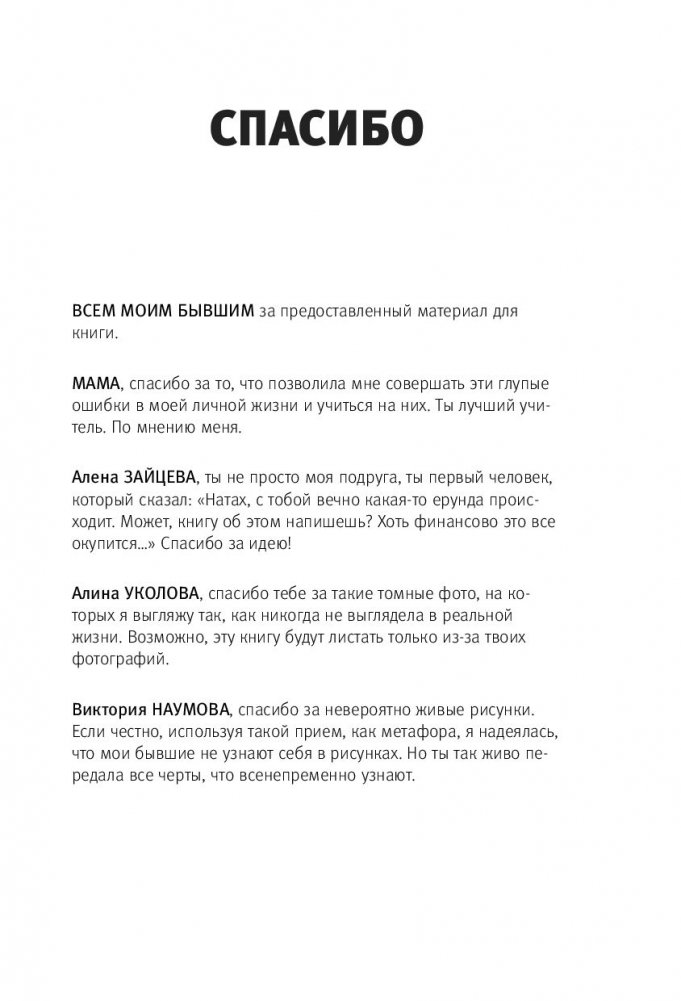 «Эта книга обо мне, такой, какая я есть: тридцативосьмилетняя женщина, мать двоих детей, разведенка, автор ТВ- и радиопрограмм, стендап-комик, учитель общеобразовательной школы и (к моему величайшему стыду) „популярный блогер, автор юмористического бьюти-блога“. Каждый бывший в свое время очень логично появлялся в моей действительности и так же логично из нее исчезал. А потом я обычно ревела, потому что „это была любовь всей моей жизни“. А потом делала выводы. А потом забывала. Потому что влюблялась в нового будущего бывшего»…