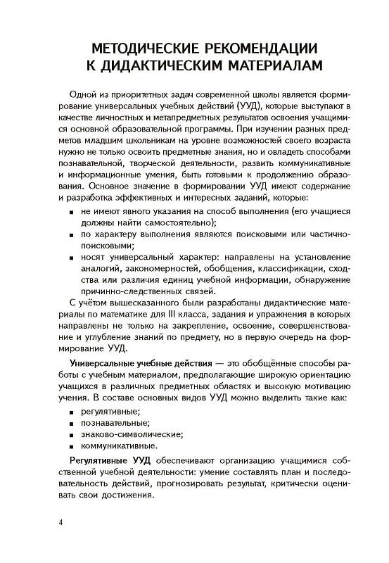 Дидактические и диагностические материалы — это дополнительный материал к действующему УМК по математике для 3-го класса, который учитель может использовать на уроках, факультативных, стимулирующих занятиях, во внеучебной деятельности при подготовке к интеллектуальным конкурсам и олимпиадам.
