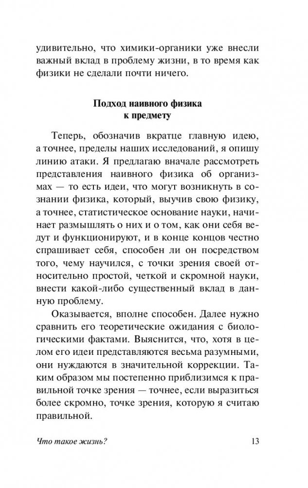 В своей знаменитой работе "Что такое жизнь?", во многом определившей дальнейшее развитие сразу нескольких научных направлений, Шрёдингер также обратился к предмету, лежащему на стыке биологии, физики и химии и попытался рассмотреть живую клетку и организм в целом как физический объект. Ему хотелось понять, подчиняется ли живая материя стандартным физическим законам, как квантовая теория согласуется с генетикой и что представляет собой жизнь с точки зрения "поведения" живых объектов. В сборник также включена лекция Шрёдингера "Сознание и материя", в которой он размышляет на тему, которая еще долго останется актуальной, – что есть сознание? И что такое мир, не озаренный светом сознания? Игра без зрителей, никому не ведомая, а потому не существующая? В этой короткой, но удивительно емкой работе автору удалось сочетать несочетаемое – строгий научный подход и занимательность беллетристики. Шрёдингер предлагает нам взглянуть на феномен сознания с самых разных сторон, и это исследование оказывается увлекательней любого детектива.