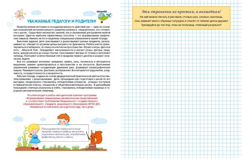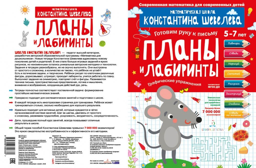 Тетради К. Шевелева уже много лет входят в первую десятку книжных рейтингов в сегменте пособий по развитию математических способностей дошкольников. Его знаменитые упражнения и графические диктанты наверняка привлекут родителей, которые хотят получить от занятий стопроцентный результат. Системно, понятно, увлекательно — три главных составляющих успеха этих красочных пособий. В каждой тетрадке — приятный бонус для маленьких математиков: страничка-черновик, на которой малыш может тренироваться столько, сколько захочет. Общий тираж пособий Константина Шевелева превышает 7 миллионов экземпляров.