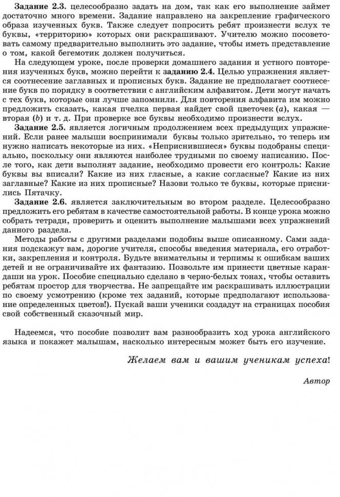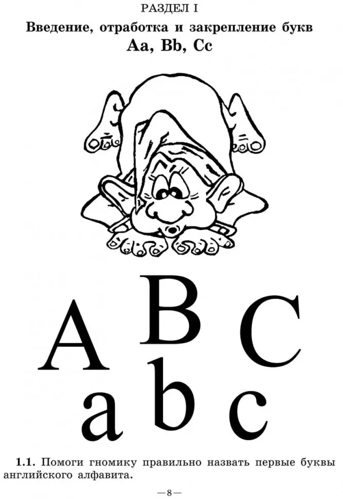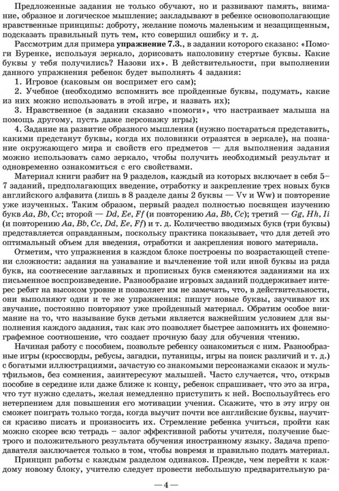 Все задания в этой книге даны в игровой форме. Материал пособия разделен на 9 разделов, каждый из которых включает в себя 5–7 упражнений, предполагающих введение, отработку и закрепление новых букв английского алфавита и повторение уже изученных. Упражнения в каждом блоке построены по возрастающей степени сложности: задания на узнавание и вычленение той или иной буквы из ряда букв, на соотнесение заглавных и прописных букв сменяются заданиями на их письменное воспроизведение. Пособие может использоваться как в работе на уроке, так и при домашнем индивидуальном обучении.
