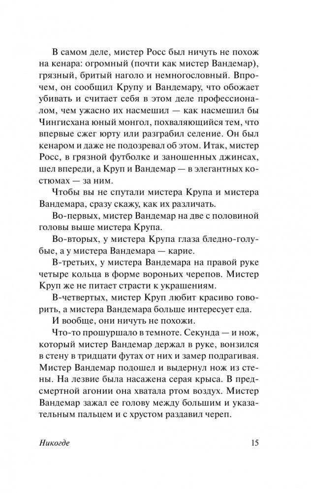 Под Лондоном скрывается место, о котором большинство людей даже не подозревает. Город монстров, святых, убийц и ангелов, рыцарей в сияющих доспехах и бледных девушек в черном бархате. Город тех, кто провалился сквозь трещины жизни. Молодой человек по имени Ричард, совершив акт доброты, оказывается в знакомом и в то же время странном мире под названием Никогде…