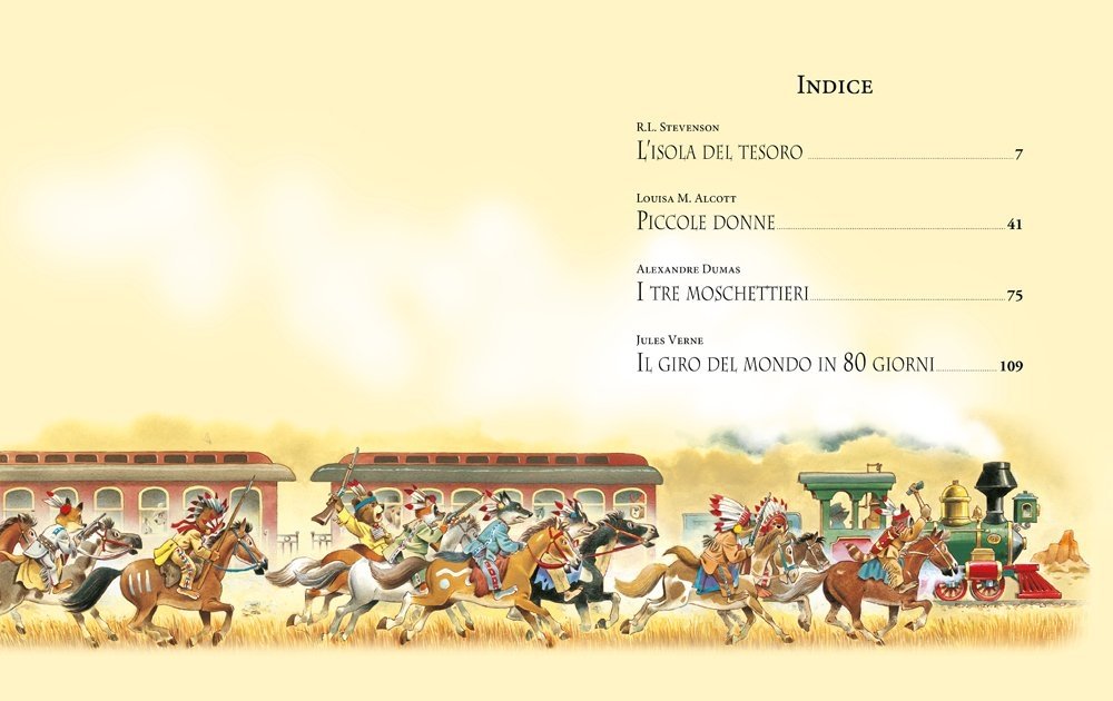 im Hawkins e la sua incredibile avventura su un'isola misteriosa... Meg, Jo, Beth e Amy e la commovente storia della famiglia March. Phileas Fogg, la sua bizzarra scommessa e il suo rocambolesco viaggio intorno al mondo. Athos, Porthos, Aramis e il loro coraggioso e irruento nuovo amico, D'Artagnan. Entrate nel mondo fantastico racchiuso in questo libro: vi aspettano i romanzi che hanno fatto la storia della letteratura di tutti i tempi e per questo sono chiamati "classici". Perché anche i più piccoli possano emozionarsi e sognare con queste storie, ecco il libro dedicato a loro, in cui i classici di tutti i tempi sono stati riscritti a misura di bambino e illustrati da Tony Wolf, che ne ha interpretato i protagonisti in maniera assolutamente nuova, fresca e geniale. Età di lettura: da 6 anni.