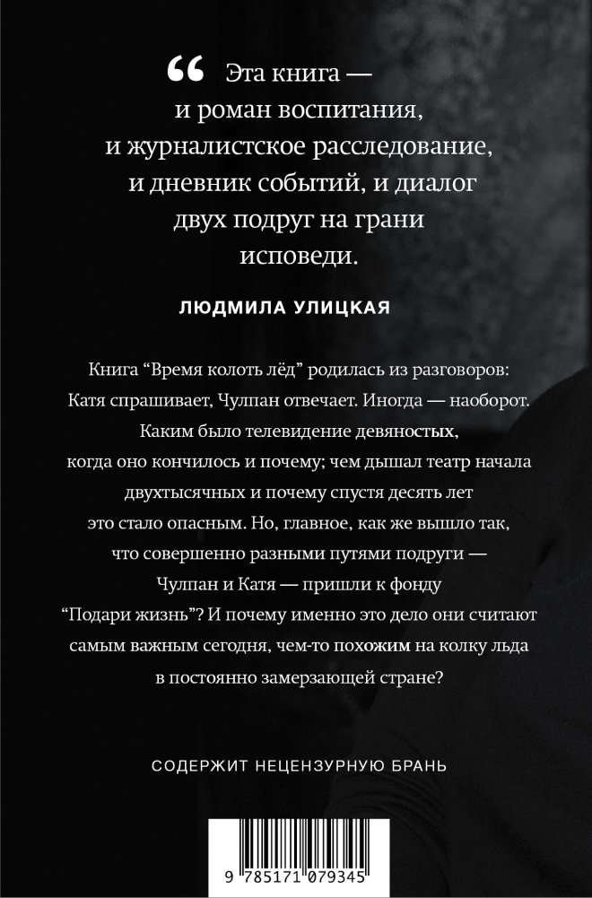 Книга “Время колоть лёд” родилась из разговоров актрисы Чулпан Хаматовой и ее подруги, журналиста, кинодокументалиста Катерины Гордеевой. Катя спрашивает, Чулпан отвечает. Иногда — наоборот. Каким было телевидение девяностых, когда оно кончилось и почему; чем дышал театр начала двухтысячных и почему спустя десять лет это стало опасным. Но, главное, как же вышло так, что совершенно разными путями подруги — Чулпан и Катя — пришли к фонду “Подари жизнь”? И почему именно это дело они считают самым важным сегодня, чем-то похожим на колку льда в постоянно замерзающей стране?