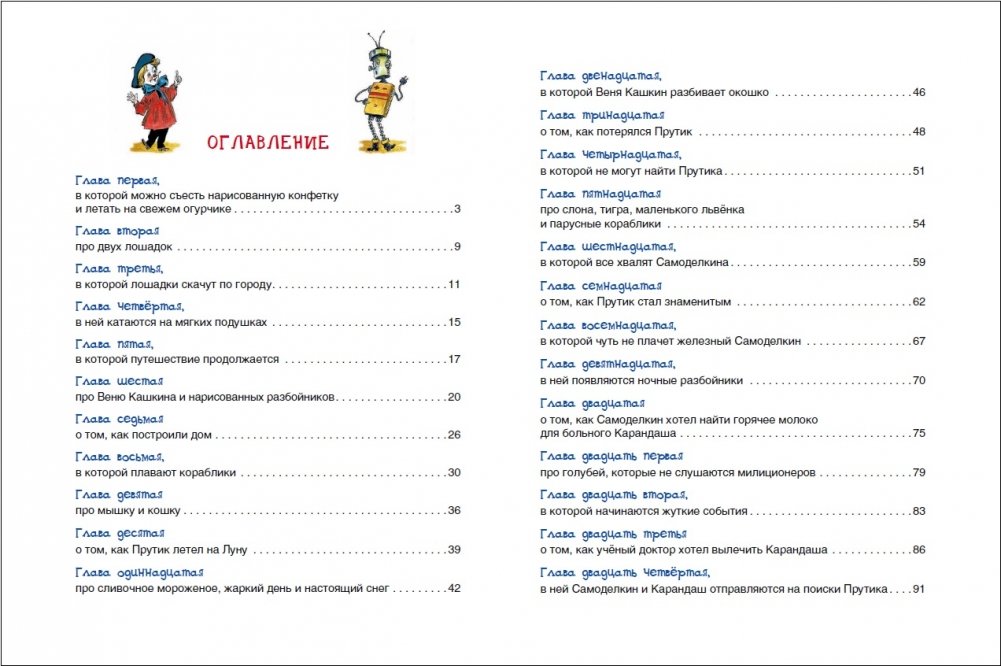 Книга расскажет о приключениях двух маленьких человечков — художнике Карандаше и мастере Самоделкине. Рисунки Карандаша мгновенно оживают, а Самоделкин может смастерить любой, даже самый сложный механизм! Вместе веселые человечки изобретут необыкновенный автомобиль, построят дом, воспитают нарисованного мальчика и одолеют злых разбойников. Иллюстрации Анатолия Елисеева.