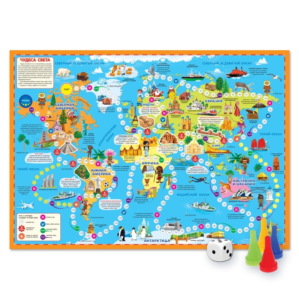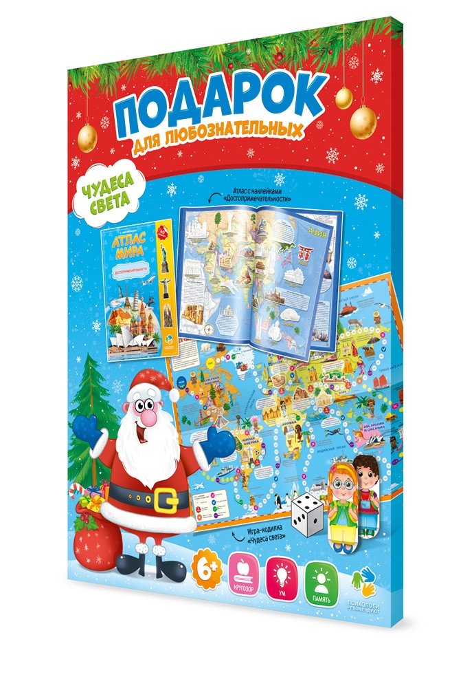 Подарок для любознательных новогодний. Чудеса света. Атлас с наклейками + Игра-ходилка