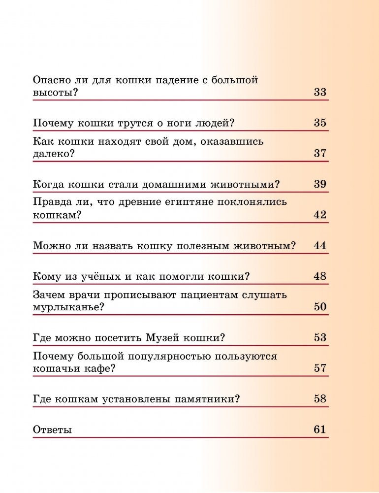 Страницы этой книги познакомят юных читателей с тайнами наших домашних питомцев – кошек. Дед Природовед расскажет, зачем кошки мяукают, как и почему они это делают. Вы узнаете, чем удивительны глаза кошек и почему кошки хорошо видят в сумерках и ночью. А также, почему светятся в темноте глаза кошек, отчего у кошки шершавый язык, почему большинство кошек купаться не любят? Почему кошки трутся о ноги людей? Зачем врачи советуют пациентам слушать мурлыканье? Где можно посетить Музей кошки и где кошкам установлены памятники?