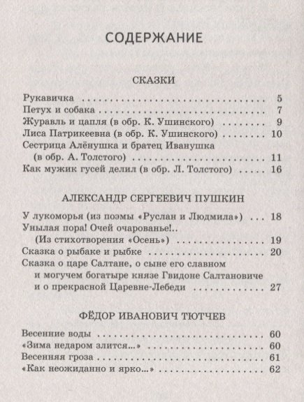 В книгу включены русские народные сказки, стихотворения и сказки А.С. Пушкина, рассказы Льва Толстого для детей и многие другие стихотворения, рассказы, повести русских писателей, которые изучают в начальной школе.
