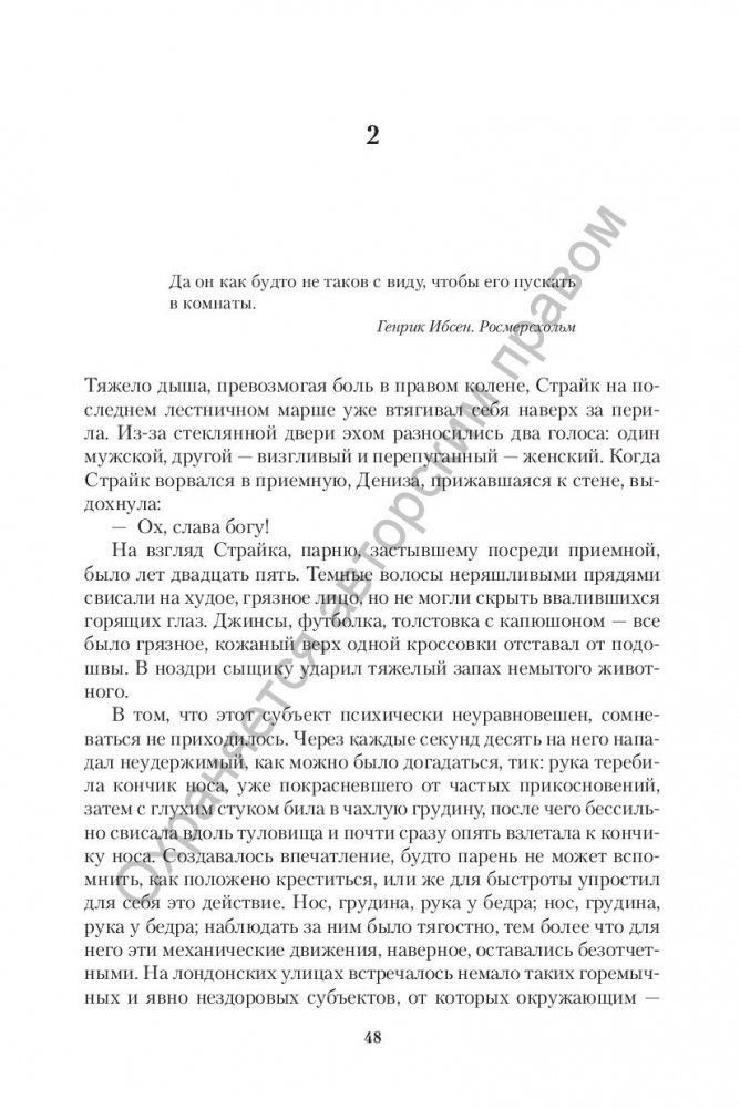 У Билли явные проблемы с умственным здоровьем, но он уверен, что в детстве видел убийство ребенка, - и давняя тревога наконец приводит его в офис частного детектива Корморана Страйка, вновь прославившегося после поимки Шеклуэллского Потрошителя. Договорить Билли не успевает, спугнутый перспективой скорого приезда полиции, но его история не выходит у Страйка из головы. Попытки докопаться до истины поведут Страйка и его помощницу Робин Эллакотт (ставшую полноценным партнером в их агентстве) сложным извилистым путем: от окраинных клубов, где собираются противники Лондонской олимпиады, - в пропитанные интригами коридоры власти, от парламентских кабинетов - к окутанному тайной имению в глубине Оксфордшира... Но еще неизвестно, что будет Корморану и Робин сложнее - разгадать эту головоломную загадку или разобраться в своих чувствах.
