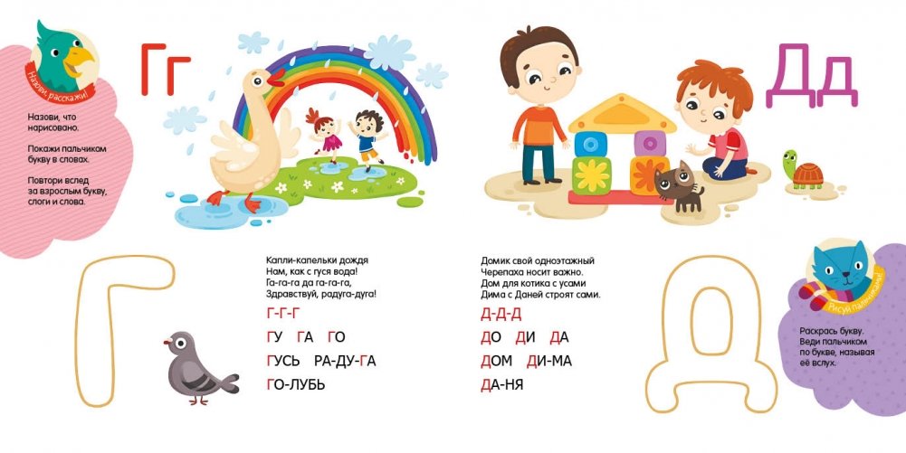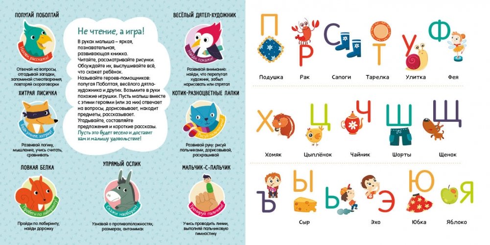 Не чтение, а игра! В руках малыша – яркая, познавательная, развивающая книжка. Читайте, рассматривайте рисунки. Обсуждайте их, выслушивайте всё, что скажет ребёнок. Называйте героев-помощников: попугая Поболтая, весёлого дятла- художника и других. Возьмите в руки похожие игрушки. Пусть малыш вместе с этими героями (или за них) отвечает на вопросы, дорисовывает, находит предметы, рассказывает. Угадывайте, составляйте предложения и короткие рассказы. Пусть это будет весело и доставит вам и малышу удовольствие!