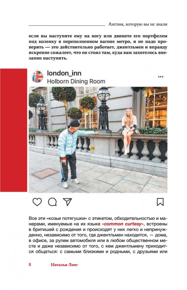 Вы знаете, что five o’clock на самом деле начинается в 16.00, а типичный завтрак англичанина – это не овсянка? Откуда взялось блюдо Fish & Chips? Почему традиционные английские пудинги и пироги несладкие? Как есть Жабу-в-норке? Что такое «время пиммса»? Почему город стоит на сэндвичах с беконом? Как выглядит купальная машина и зачем принимать душ с друзьями? Зачем нужно столько пабов? А также особенности менталитета, диалекта и обычаев англичан, национальные блюда и напитки, все фишки лондонской жизни – всем этим в своем блоге @london_inn делится Наталья Лэнг, а теперь и с вами, дорогие читатели!