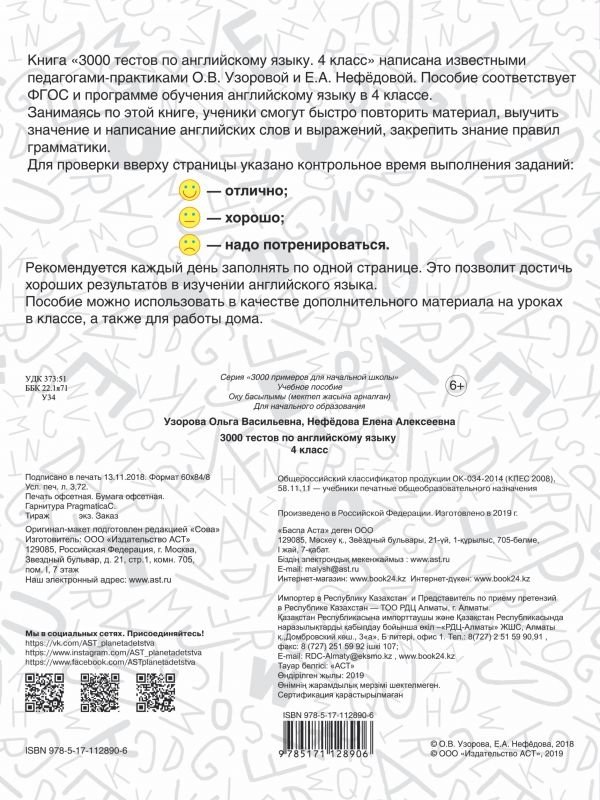 Книга написана известными педагогами-практиками О.В. Узоровой и Е.А. Нефёдовой, авторами более 700 учебных пособий для начальной школы. Материал пособия соответствует ФГОС и программе обучения английскому языку в 4 классе и даёт возможность ученикам быстро проверить свои знания по английскому языку. Учителя и родители могут отметить время, которое ребёнок затратил на выполнение тестов. На каждой странице дано контрольное время. Пособие можно использовать в качестве дополнительного материала на уроках в классе, а также для работы дома. Для начального образования.