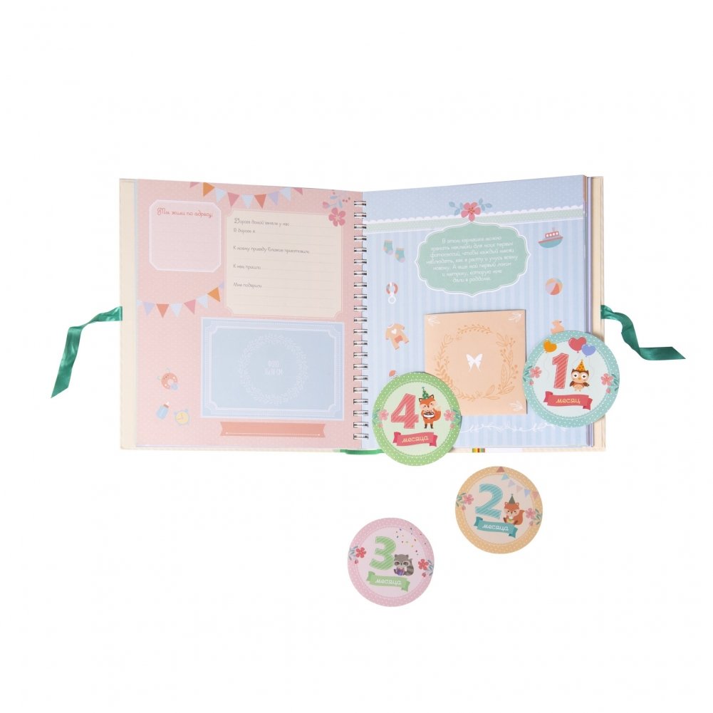 В этом альбоме с нежными иллюстрациями есть все необходимое, чтобы сохранить драгоценные воспоминания о первом годе жизни малыша: конверты для памятных вложений, места для вклеивания множества фотографий и для записей о главных событиях первого года жизни. А на обложке - окошко-вложение для фотографии малыша. В альбоме Вы сможете записать, когда у малыша появился первый зубик, как менялись его рост и вес по месяцам, по какому адресу жили родители, когда младенец появился на свет, и многое-многое другое. Здесь даже есть разворачивающиеся странички, вмещающие на одном развороте сразу 12 фотографий, соответствующих 12-ти первым месяцам жизни ребёнка. Раскрыв их спустя время, Вы легко проследите, как быстро рос и менялся малыш в течение всего года. А еще мам и пап ждет приятный сюрприз - 12 крупных наклеек для фотосессий по месяцам!