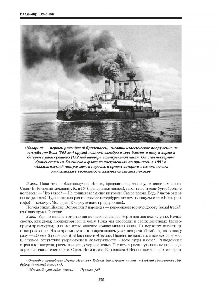 В.И. Семёнов был единственным офицером Российского Императорского флота, которому в годы Русско-японской войны довелось служить и в Первой, и во Второй Тихоокеанских эскадрах и участвовать в обоих главных морских сражениях – в Порт-Артуре и при Цусиме. В последнем бою, находясь на флагмане русской эскадры, Семёнов получил пять ранений и после возвращения из японского плена прожил совсем недолго, но успел дополнить и обработать свои дневники, которые вел во время боевых действий.