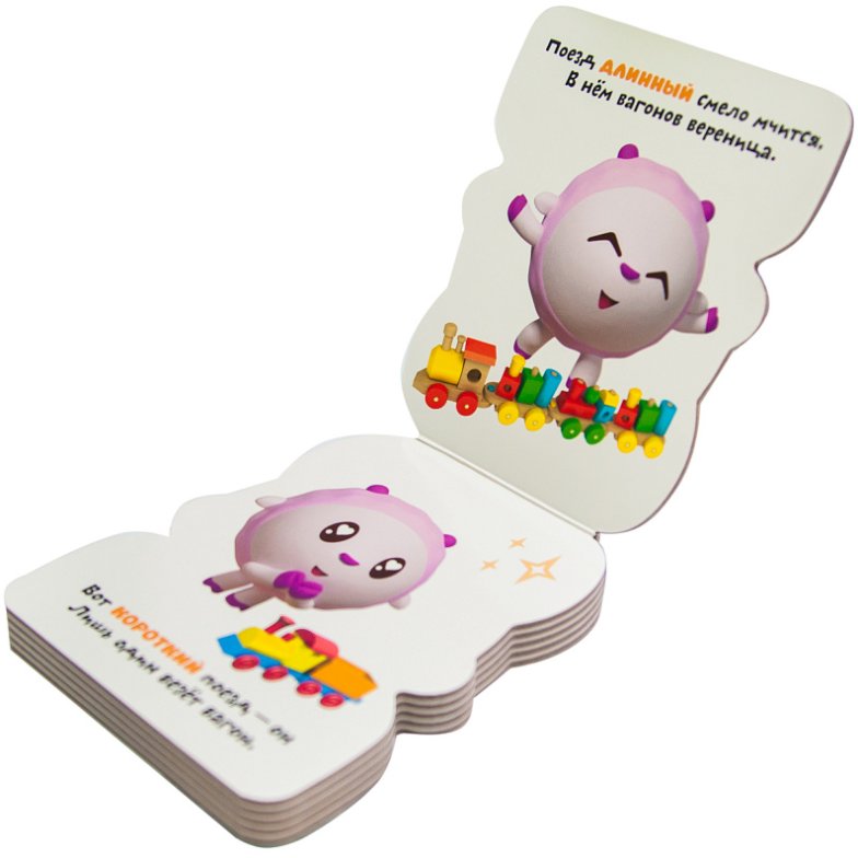 С книжкой «Короткий - длинный» серии «Малышарики. Книжки-фигурки» можно играть, как с игрушкой! Книжка-игрушка в форме очаровательного Барашика познакомит малыша с антонимами. Рассматривая крупные иллюстрации и слушая веселые стихи, он легко запомнит понятия: «короткий» и «длинный».