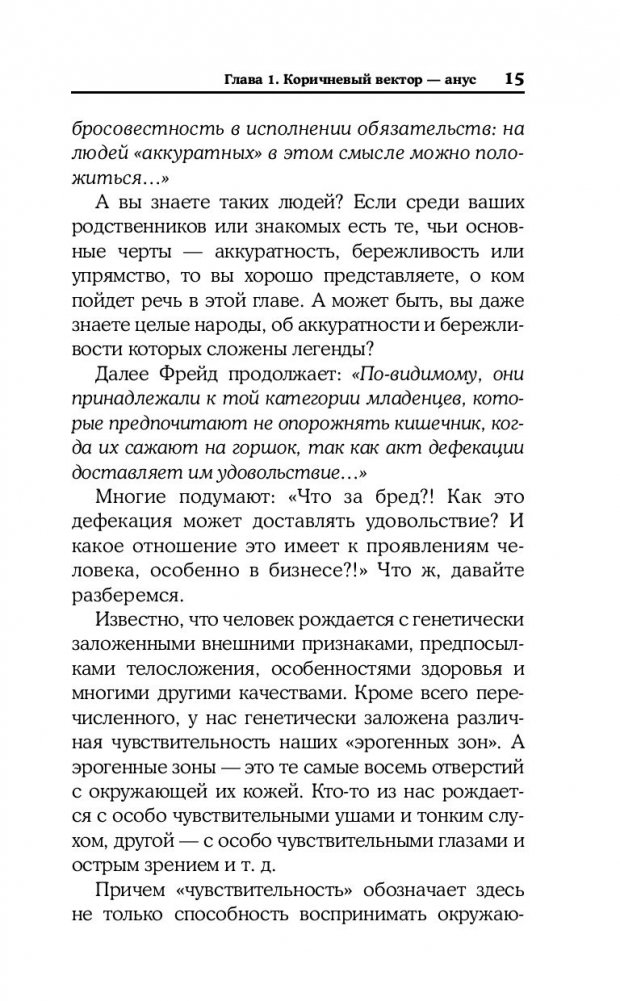 В начале прошлого века Зигмунд Фрейд предположил, что характер человека как-то связан с чувствительными отверстиями на нашем теле (рот, нос, ухо, глаз и другие). Сто лет назад Фрейд еще не знал или был не готов открыто заявить, что чувствительность этих отверстий обусловливает все сферы жизни человека: от состояния здоровья до сексуальных пристрастий, от выбора профессии до стиля ведения бизнеса. Из этой книги вы узнаете, какие существуют типы людей в зависимости от ведущей чувствительной зоны, и как могут помочь эти знания в различных ситуациях вашей жизни. В увлекательных и порой смешных историях автор рассказывает о психологических инструментах, которые вы сможете применять для построения гармоничных отношений с детьми и родителями, близкими и незнакомыми людьми, в бизнесе и в личной жизни.