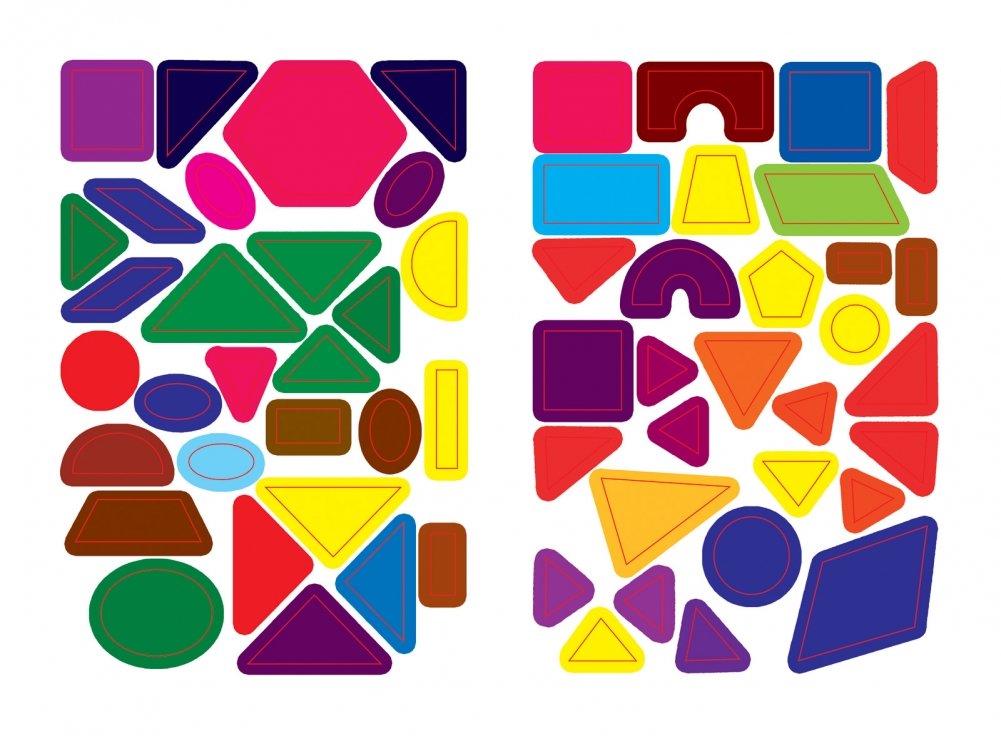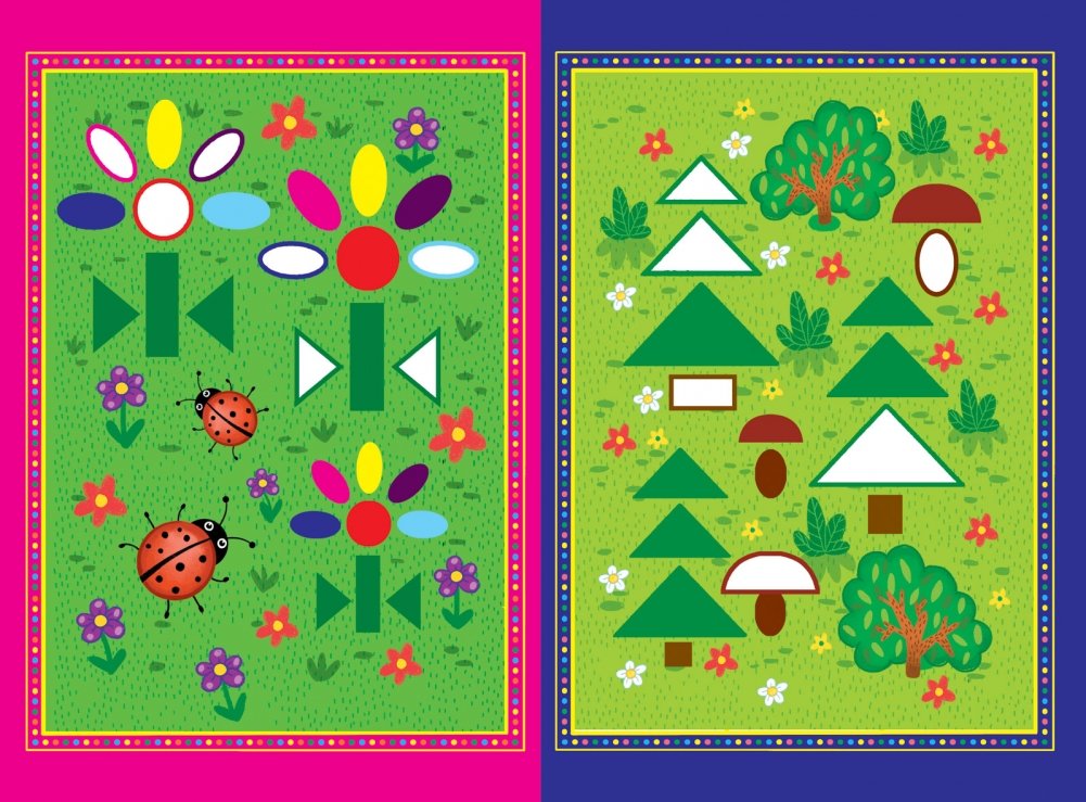 Внутри книжки вы найдёте 10 картинок. Некоторые области изображения на них пропущены и закрашены белым цветом. Помогите ребёнку найти в наклейках геометрические фигуры, соответствующие пропущенной области, и приклеить их на картинку. Похвалите малыша за хорошую работу!