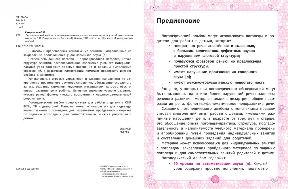 В пособии представлены комплексные занятия, направленные на закрепление произношения у дошкольников звука [л]. Особенность данного пособия — апробированная методика, чёткая структура занятий, последовательное изложение учебного материала. Каждый урок содержит простые пояснения и образцы выполнения упражнений, а красочные иллюстрации помогают поддержать интерес ребёнка к занятиям. Увлекательные игровые упражнения и задания направлены на закрепление правильного звукопроизношения, обогащение словарного запаса, создание стимулов, «пусковых механизмов», которые обеспечивают развитие речи ребёнка. Основное внимание уделено развитию чувства ритма, фонематического восприятия и лексико-грамматической стороны речи. Логопедический альбом предназначен для работы с детьми дошкольного возраста с ОНР, ФФН, ФН и дизартрией. Материал может использоваться для индивидуальных занятий с логопедом, для закрепления пройденного материала по заданию логопеда и для самостоятельных занятий родителей с детьми.