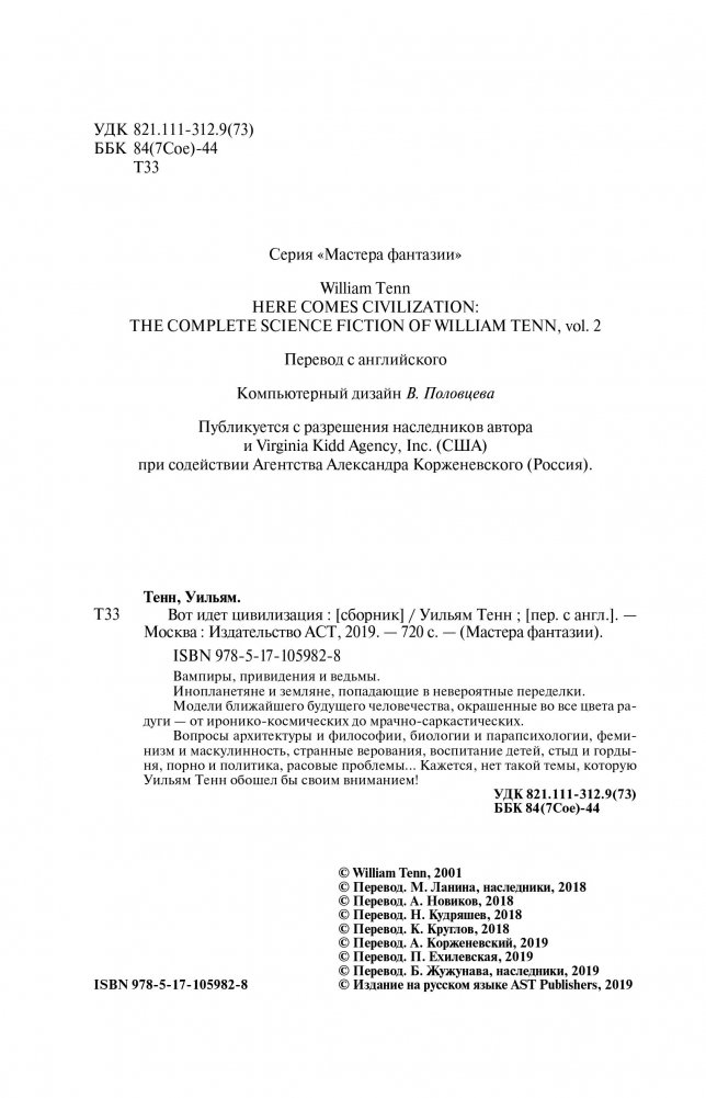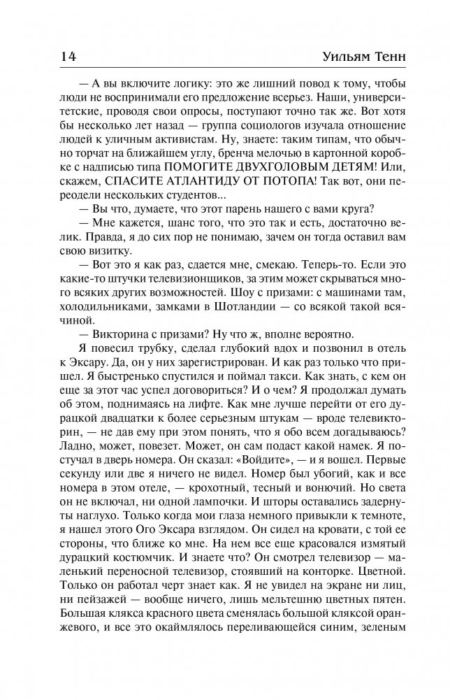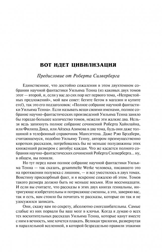 Вопросы архитектуры и философии, биологии и парапсихологии, феминизм и маскулинность, странные верования, воспитание детей, стыд и гордыня, порно и политика, расовые проблемы… Кажется, нет такой темы, которую Уильям Тенн обошел бы своим вниманием!