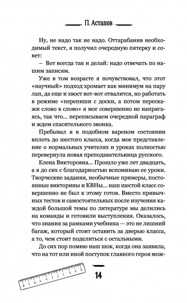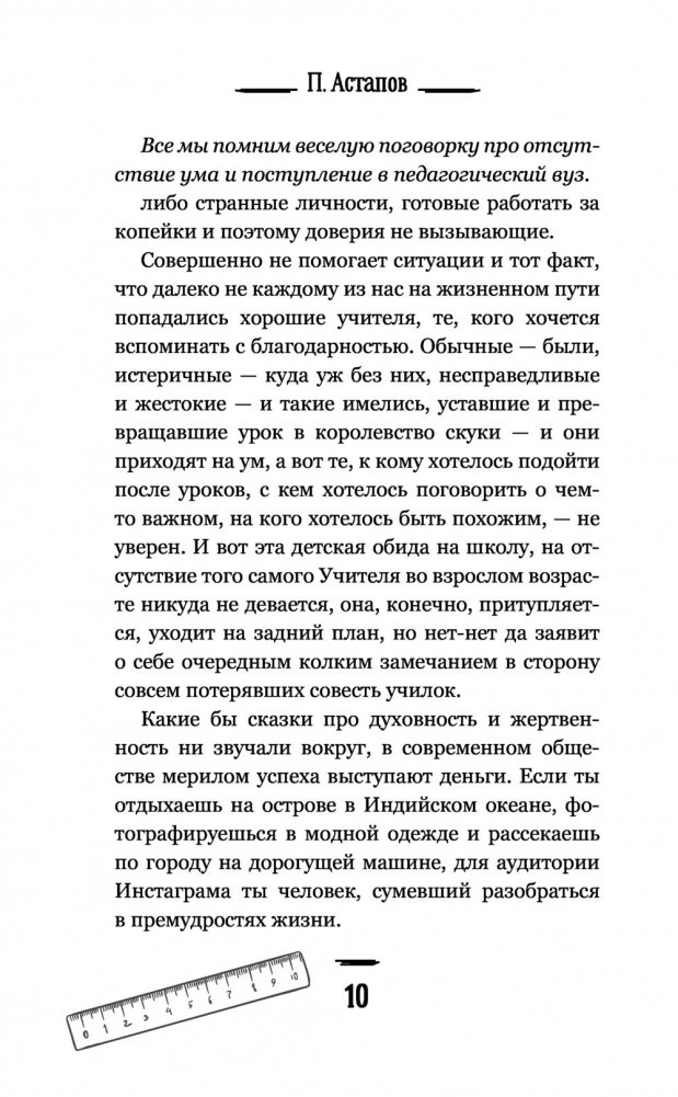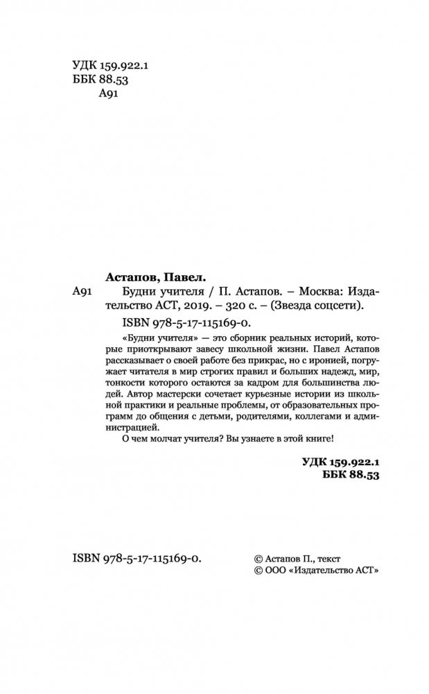 "БУДНИ УЧИТЕЛЯ" — это сборник реальных историй, которые приоткрывают завесу школьной жизни. Павел Астапов рассказывает о своей работе без прикрас, но с иронией, ПОГРУЖАЕТ ЧИТАТЕЛЯ В МИР СТРОГИХ ПРАВИЛ И БОЛЬШИХ НАДЕЖД, МИР, ТОНКОСТИ КОТОРОГО ОСТАЮТСЯ ЗА КАДРОМ ДЛЯ БОЛЬШИНСТВА ЛЮДЕЙ. Автор мастерски сочетает курьезные истории из школьной практики и реальные проблемы — от образовательных программ до общения с детьми, родителями, коллегами и администрацией. О ЧЕМ МОЛЧАТ УЧИТЕЛЯ? ВЫ УЗНАЕТЕ В ЭТОЙ КНИГЕ!