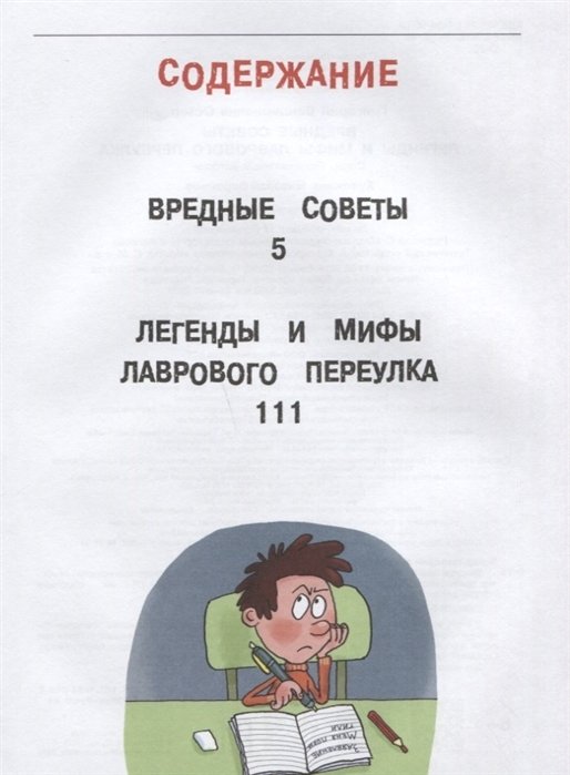 В книгу вошли произведения Г. Остера с иллюстрациями Николая Воронцова: "Вредные советы" и "Легенды и мифы Лаврового переулка". Это остроумные, парадоксальные истории про детей и родителей, учителей и учеников, друзей и недругов и даже про матёрых преступников. Героями Г. Остера стали не только люди, но и умные, самостоятельные звери. Для младшего школьного возраста.