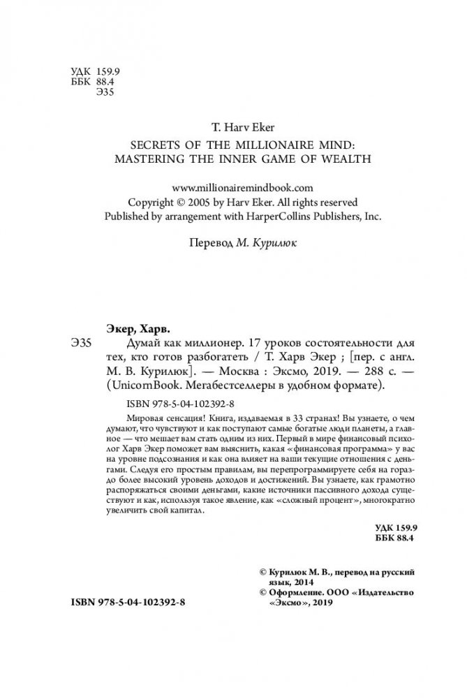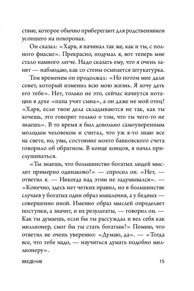Книга «Думай как миллионер» не предлагает никаких авантюрных схем с чужими деньгами. Харв Экер, ваш финансовый психолог и консультант, работает с тем, что вы имеете на данный момент: вашими укоренившимися убеждениями относительно денег и вашим текущим доходом, которым вы научитесь распоряжаться так, чтобы жить в достатке сегодня и стать финансово свободным и независимым человеком в скором будущем. Результаты ошеломят вас.