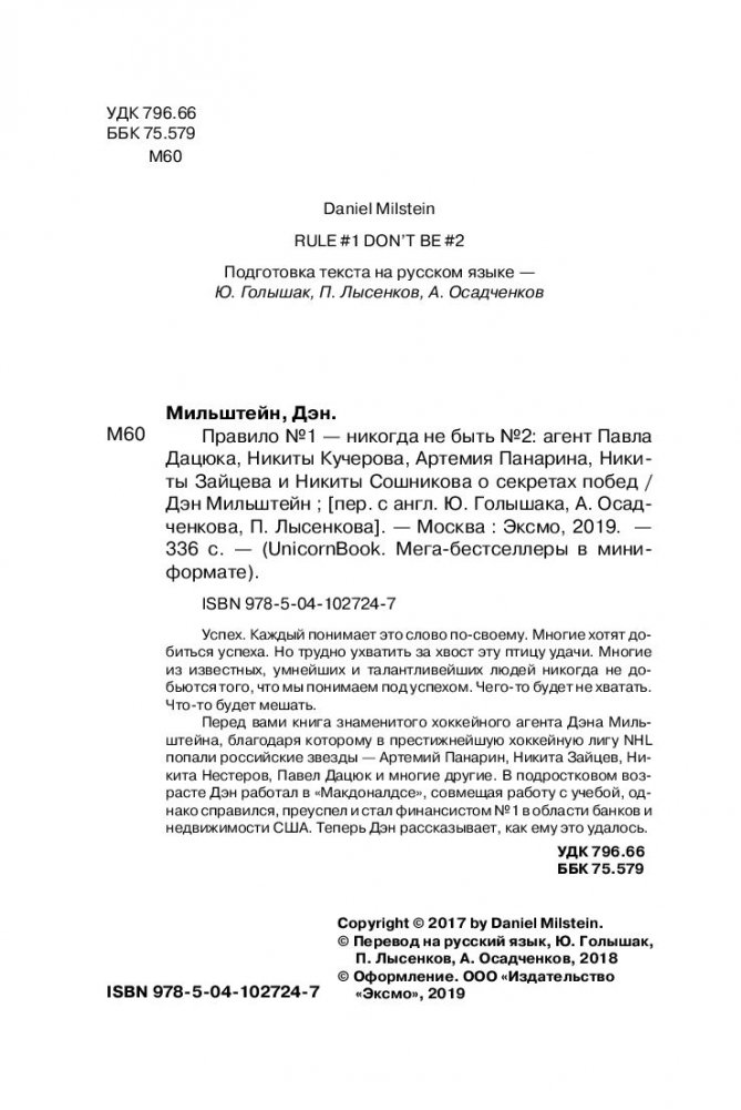 Дэн Мильштейн - основатель компании GoldStar и один из самых известных хоккейных агентов, представляющий интересы россиян в НХЛ. Благодаря ему Павел Дацюк, Никита Кучеров, Артемий Панарин и другие звезды хоккейной сборной России добились больших успехов за рубежом. Дэн впервые делится психологическими стратегиями, благодаря которым он и его подопечные кардинально изменили свою жизнь. Он научит, как в погоне за своей мечтой никогда не опускать руки. Правильно расставлять приоритеты. Выявлять свои недостатки и превращать их в достоинства, чтобы преуспеть в любимом деле и разбогатеть.