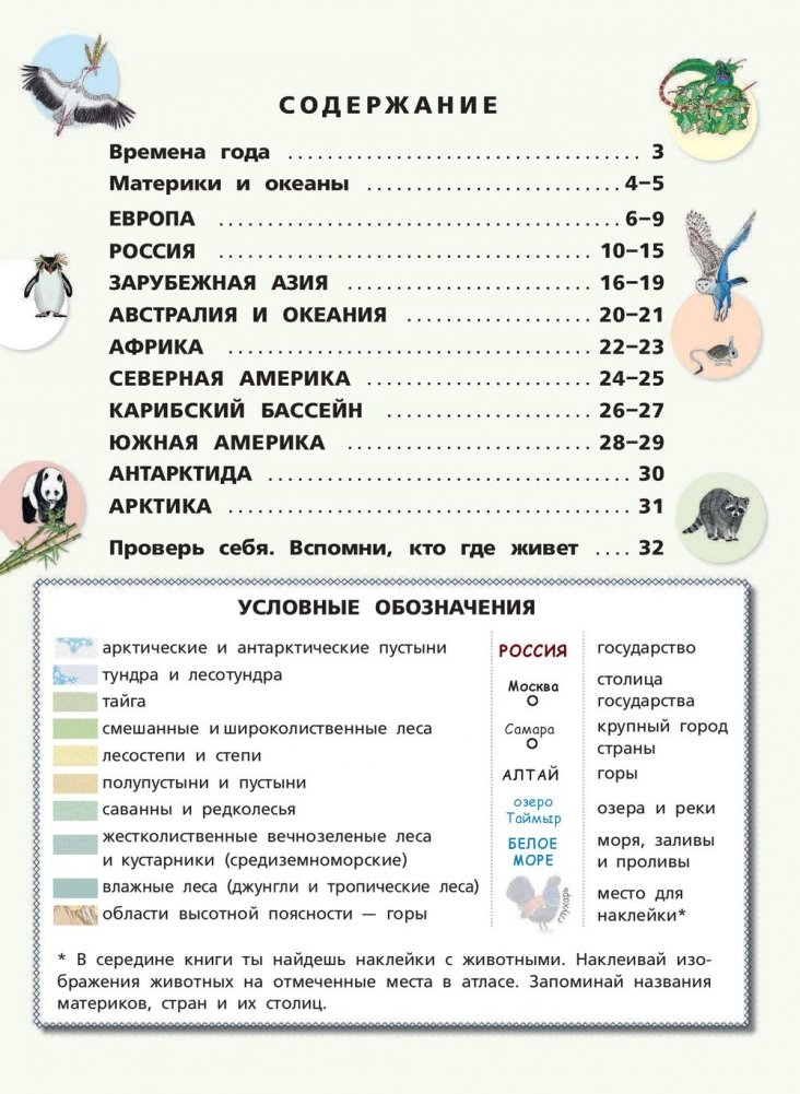 Открой атлас и соверши кругосветное путешествие по нашей планете. В середине книги размещен лист с наклейками животных - рассматривай атлас и наклеивай их на отмеченные места.