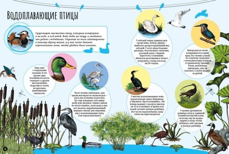 В это невозможно поверить, но утки спят с открытыми глазами, бакланы ныряют на глубину 45 метров, попугай жако может выучить 700 слов, а некоторые птицы свистят крыльями и даже мяукают. Но не будем лишать тебя удовольствия прочитать об этом самому.