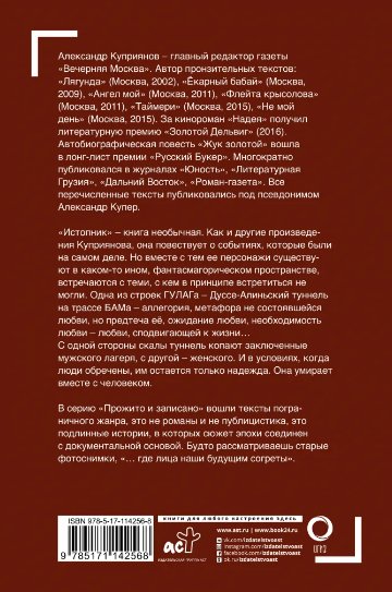 «Истопник» – книга необычная. Как и другие произведения Куприянова, она повествует о событиях, которые были на самом деле. Но вместе с тем ее персонажи существуют в каком-то ином, фантасмагорическом пространстве, встречаются с теми, с кем в принципе встретиться не могли. Одна из строек ГУЛАГа – Дуссе-Алиньский туннель на трассе БАМа – аллегория, метафора не состоявшейся любви, но предтеча её, ожидание любви, необходимость любви – любви, сподвигающей к жизни…