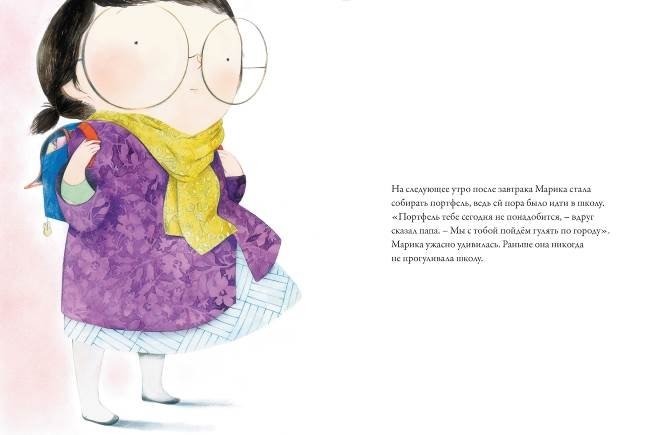 Марика сидела у зеркала и вздыхала. На день рождения ей подарили платье, похожее на розовое облако. "Подарок для моей любимой принцессы", — сказал папа. Марика считает, что она совсем не похожа на принцессу — принцессы не носят очков и зубы у них всегда ровные. Но папа с ней не согласен. Он знакомит Марику с парикмахером, у которой золотые руки; с булочницей, которая умеет печь вкуснейшие шоколадные торты… И доказывает, что принцессой может быть каждая!