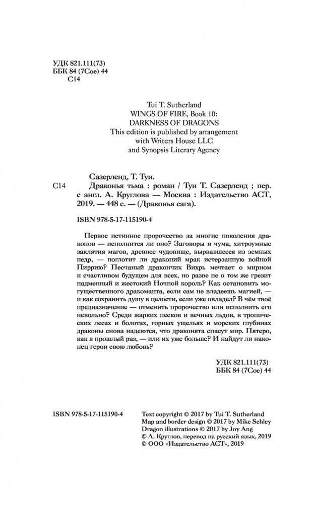 Первое истинное пророчество за многие поколения драконов — исполнится ли оно? Заговоры и чума, хитроумные заклятия магов, древнее чудовище, вырвавшееся из земных недр, — поглотит ли драконий мрак истерзанную войной Пиррию? Песчаный дракончик Вихрь мечтает о мирном и счастливом будущем для всех, но разве не о том же грезит надменный и жестокий Ночной король? Как остановить могущественного дракоманта, если сам не владеешь магией, — и как сохранить душу в целости, если уже овладел? В чём твоё предназначение — отменить пророчество или исполнить его невольно? Среди жарких песков и вечных льдов, в тропических лесах и болотах, горных ущельях и морских глубинах драконы снова надеются, что драконята спасут мир. Пятеро, как в прошлый раз, — или их уже больше? И найдут ли, наконец, герои свою любовь?