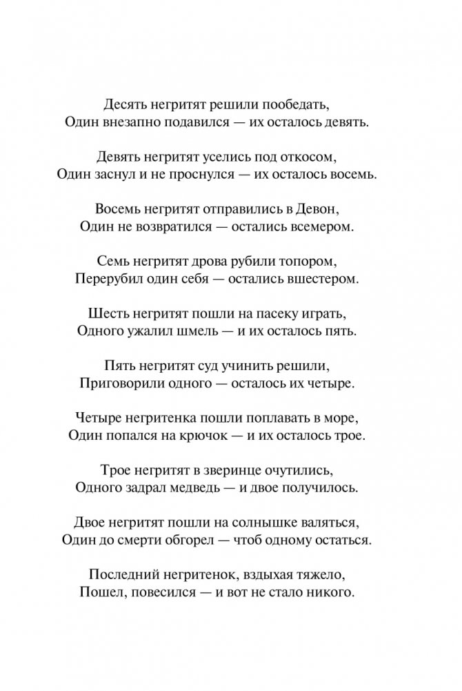Десять никак не связанных между собой людей в особняке на уединенном острове... Кто вызвал их сюда таинственным приглашением? Зачем кто-то убивает их, одного за другим, самыми невероятными способами? Почему все происходящее так тесно переплетено с веселым детским стишком?