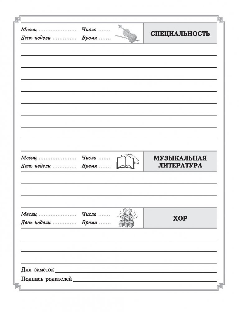 Если ваш ребенок занимается в музыкальной школе, без этого дневника ему не обойтись! Издание позволяет систематизировать обучение, поскольку содержит все необходимые ученику сведения: расписание уроков, данные о преподавателях, специальные разделы для оценок и подведения итогов, а также разные памятки и много полезной справочной информации для того, кто занимается музыкой.
