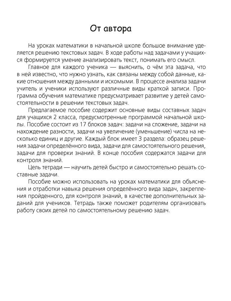 В тетради содержатся основные виды составных задач для 2 класса, приведен алгоритм их решения, в каждой теме дан образец выполнения заданий.