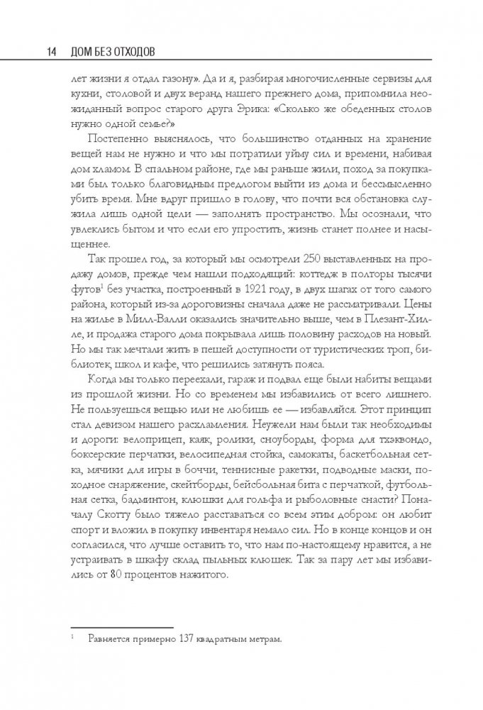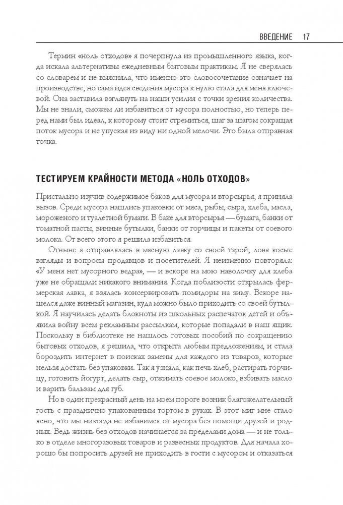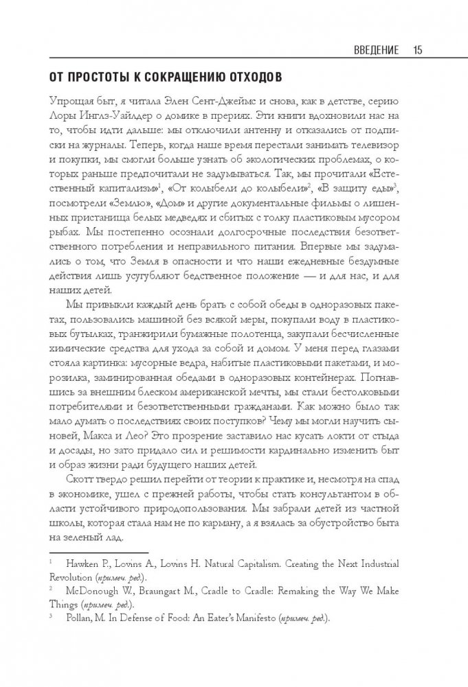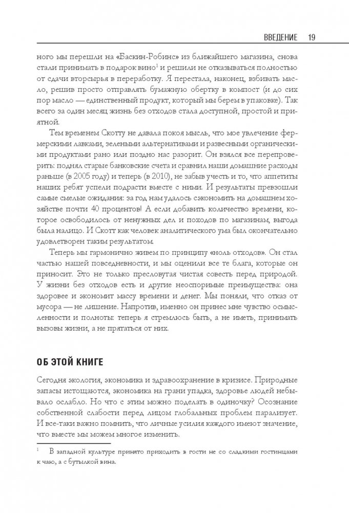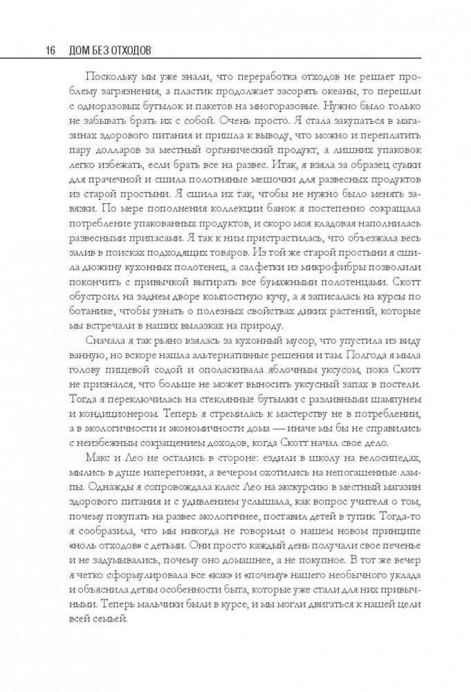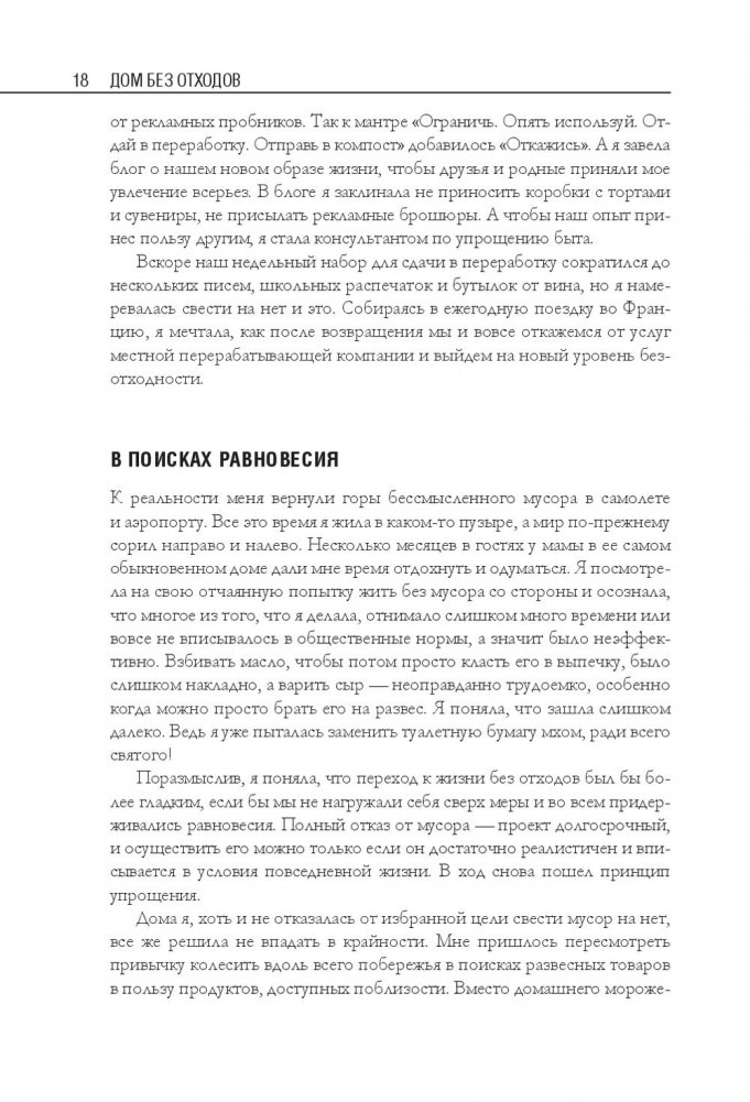 Беа Джонсон — активистка движения «ноль отходов» (Zero Waste). Ее семья из четырех человек и собаки оставляет только одну банку отходов в год и экономит до 40 процентов бюджета. В этой книге автор делится своим опытом и подробно описывает, как организовать быт в соответствии с правилом пяти «О»: отказаться от ненужного; ограничить необходимое; опять использовать уже приобретенное; отдавать на переработку то, что не можете использовать; отправлять в компост остальное. Это правило поможет вам сберечь природные ресурсы, расхламить пространство, избавиться от власти ненужных вещей, упростить быт и освободить время для действительно важных дел.