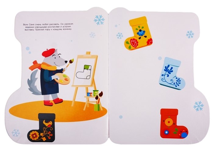 В этой книжке так много Валенок! Украшай их разными узорами и приклеивай весёлых зверюшек. Скоро Новый год! Не забудь про валенки Дедушки Мороза и Снегурочки.