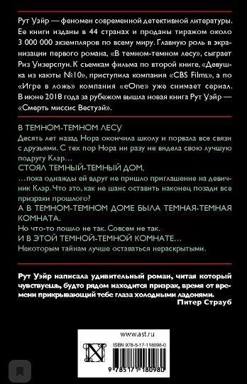 Десять лет назад Нора окончила школу и порвала все связи с друзьями. С тех пор Нора ни разу не видела свою лучшую подругу Клэр… Пока однажды ей вдруг не пришло приглашение на девичник Клэр. Что это, как не шанс оставить наконец позади все призраки прошлого? А В ТЕМНОМ-ТЕМНОМ ДОМЕ БЫЛА ТЕМНАЯ-ТЕМНАЯ КОМНАТА. Но что-то пошло не так. Совсем не так. И В ЭТОЙ ТЕМНОЙ-ТЕМНОЙ КОМНАТЕ… Некоторым тайнам лучше оставаться не раскрытыми.