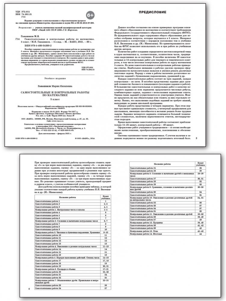 Пособие содержит самостоятельные и контрольные работы по математике для 5 класса. Материал представлен в порядке изложения тем в учебнике Н.Я. Виленкина и др. (М.: Мнемозина), однако может быть использован и при работе по учебникам других авторов. Пособие содержит 39 самостоятельных работ и 14 контрольных для текущего и тематического контроля. Все задания даны в трех равнозначных вариантах и в одном варианте повышенного уровня сложности и соответствуют программе общеобразовательной школы и требованиям ФГОС.