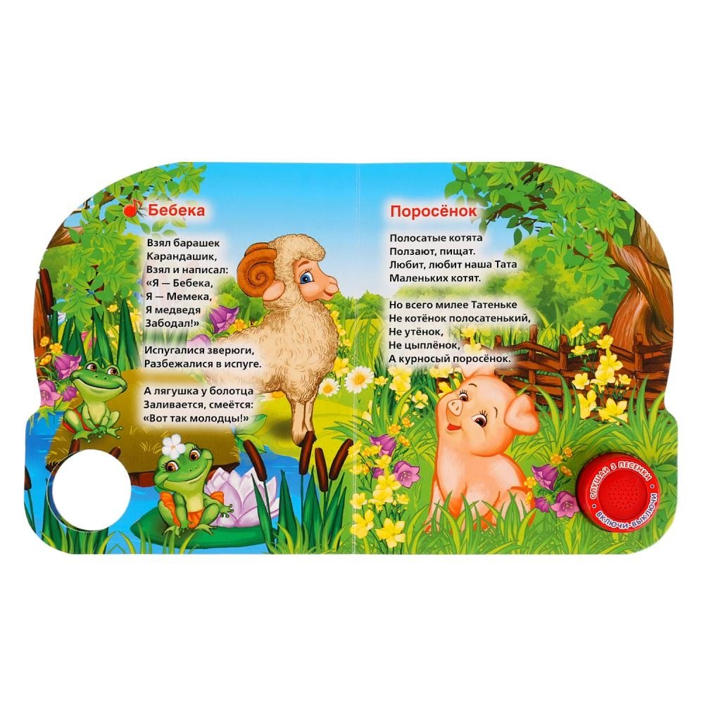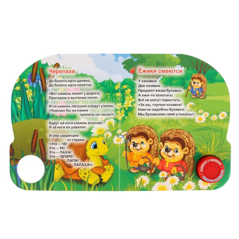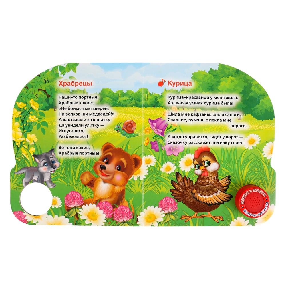 Компактная книга из прочного безопасного картона с кнопкой для прослушивания. Любимые авторы, народные фольклор, истории по мультфильма, и конечно, 3 песенки!