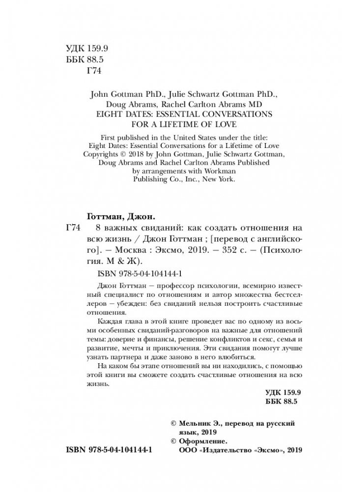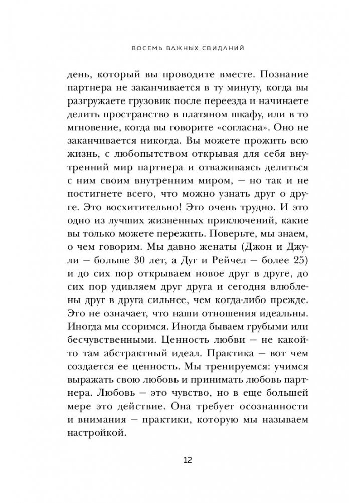 Каждая глава в этой книге проведет вас по одному из восьми особенных свиданий-разговоров на важные для отношений темы: доверие и финансы, решение конфликтов и секс, семья и развитие, мечты и приключения. Эти свидания помогут лучше узнать партнера и даже заново в него влюбиться.