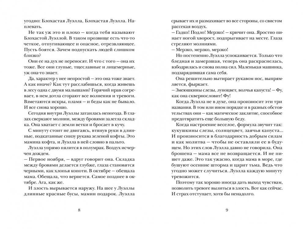 Луэлла живет в лесу с двумя братьями-малышами — вдали от других людей. Она очень ждет маму, а папу совсем не помнит. Мама иногда присылает письма, вместо папы Луэлла соорудила пугало. Странно? Да, Луэлла — странная девочка. Она может даже напугать, особенно когда произносит слова, похожие на заклинание: «Змеюшкины слезы, луноцвет, волчья капуста…»