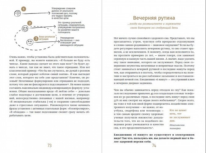 Цитаты: «В основе ежедневника лежит простой принцип: обращать внимание нужно не только на то, чего вам не хватает или что плохо работает, а прежде всего на то, что у вас уже есть и что работает хорошо. Таким образом становится заметен позитив, и благодаря этому у вас развиваются конструктивные мысли. Ежедневник поможет вам выработать правильный баланс между оценкой и дальнейшим развитием, между благодарностью и достижением. Он поможет вам научиться по-настоящему ценить Здесь и Сейчас. Вы узнаете, как благодарность делает человека счастливым, и получите ту основу, которая позволит вам ежедневно практиковаться в проявлениях благодарности».