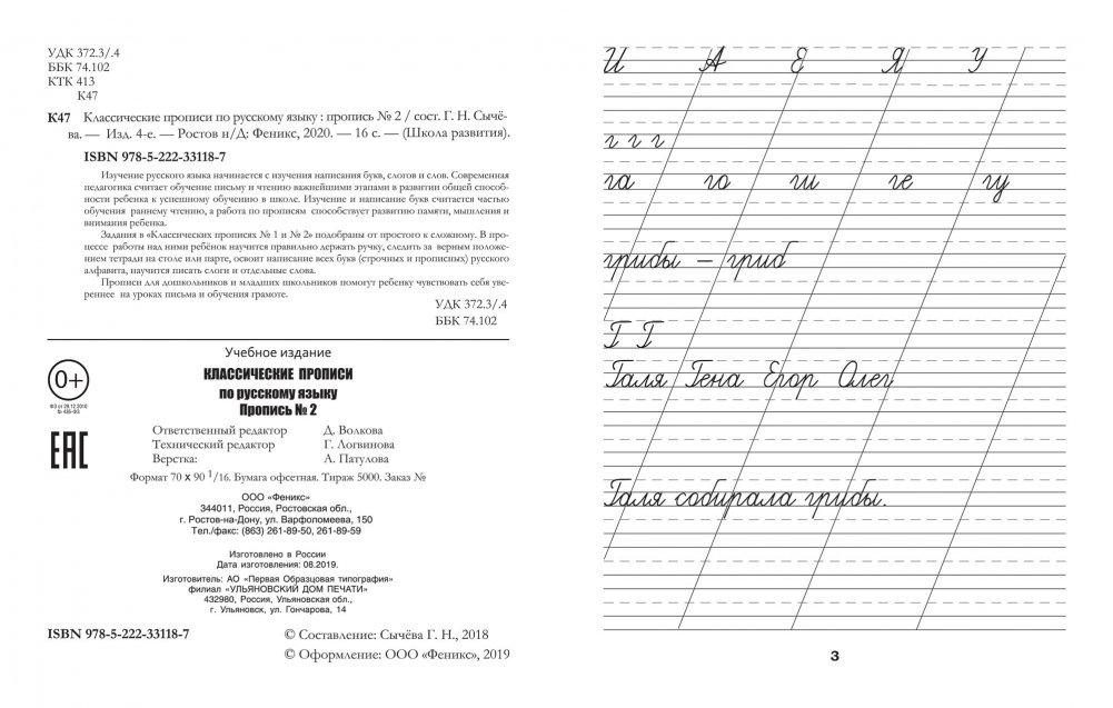 Изучение русского языка начинается с изучения написания букв, слогов и слов, Современная педагогика считает обучение письму и чтению важнейшими этапами в развитии общей способности ребенка к успешному обучению в школе. Изучение и написание букв считается частью обучения раннему чтению, а работа по прописям способствует развитию памяти, мышления и внимания ребенка. Задания в «Классических прописях № 1 и № 2» подобраны от простого к сложному. В процессе работы над ними ребенок научится правильно держать ручку, следить за верным положением тетради на столе или парте, освоит написание всех букв (строчных и прописных) русского алфавита, научится писать слоги и отдельные слова. Прописи для дошкольников и младших школьников помогут ребенку чувствовать себя увереннее на уроках письма и обучения грамоте.